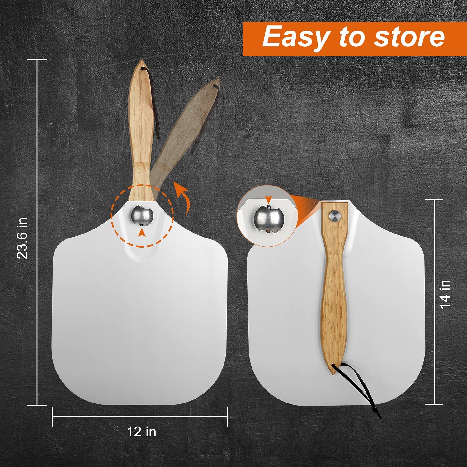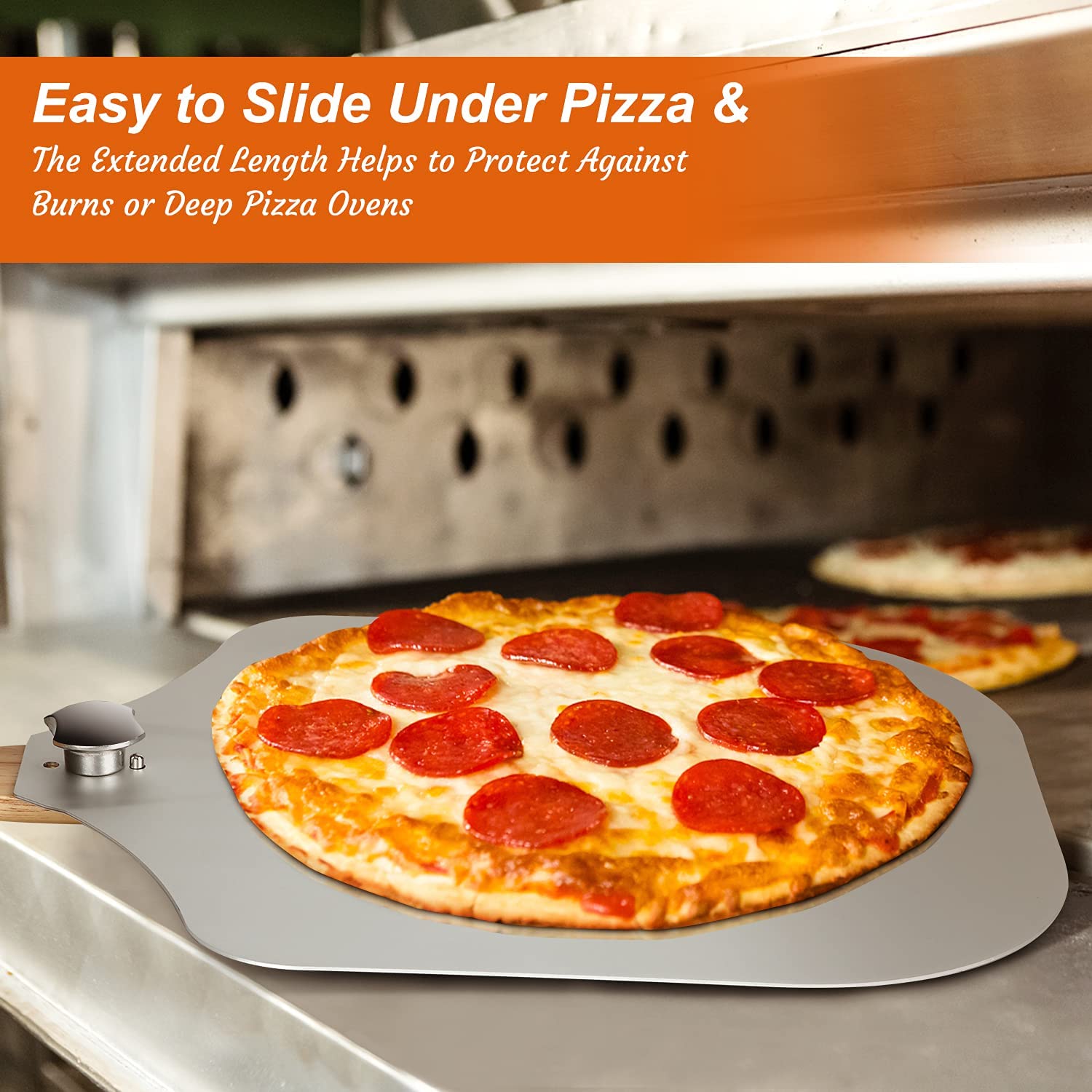- PREMIUM PIZZA PADDLE – The 12” x 14” pizza peel is made of top quality and highly durable materials – food grade aluminum.Our pizza spatula’s so slim thickness and lightweight that you can move the pizza easily.Natural wooden handle and stylish metal nut make this the ideal spatula-like tool for shoveling pizza in and out of the oven or pizza stone while keeping hands and arms away from the heat.