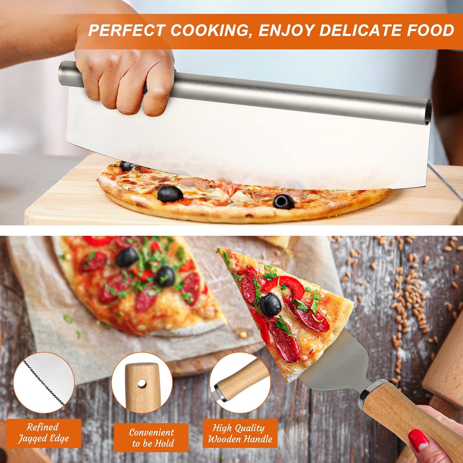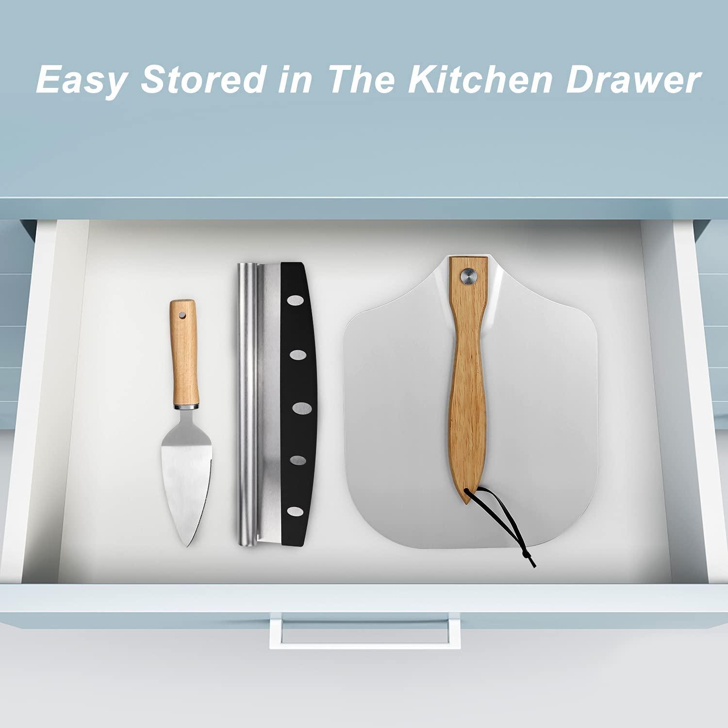 - MULTIPURPOSE – Pizza peel + rocker cutter + pizza server perfect set can finish a series of actions for making pizza. Simply own one set Diffy Homy pizza peel set that you can transfer pizzas, bread, pastries, cakes and other baked goods to and from the oven or BBQ grill, cut pizza or other cakes and use pizza server share food with family.It is a best gift for family or friend.