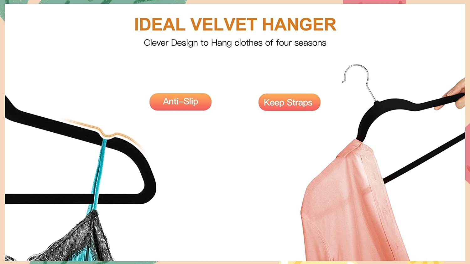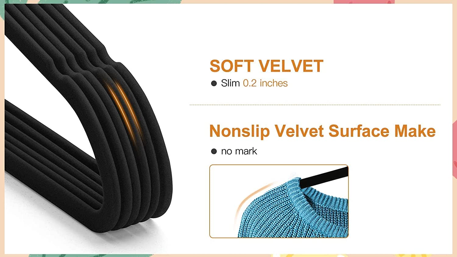 - Anti-Slip & Notched Shoulders – Quality velvet hangers covered with good fabric maintain their velvety texture. Increase the surface friction and prevent the clothes from sliding. Notched shoulders are perfect for hanging any clothing with thin straps for your tank tops, dresses, bras, ties, belts, nightgowns, shawls, and skirts.